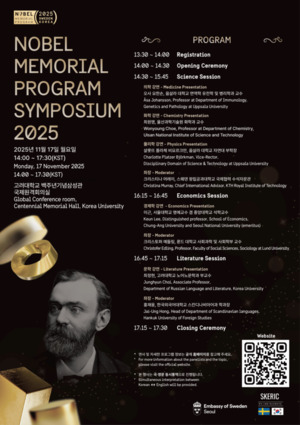 The Embassy of Sweden in Korea will host the Sweden-Korea Nobel Memorial Program Symposium 2025 on November 17 from 2:00 to 5:30 p.m. at the Centennial Memorial Samsung Hall of Korea University.The symposium aims to highlight the academic and humanitarian achievements of this year’s Nobel Prize laur